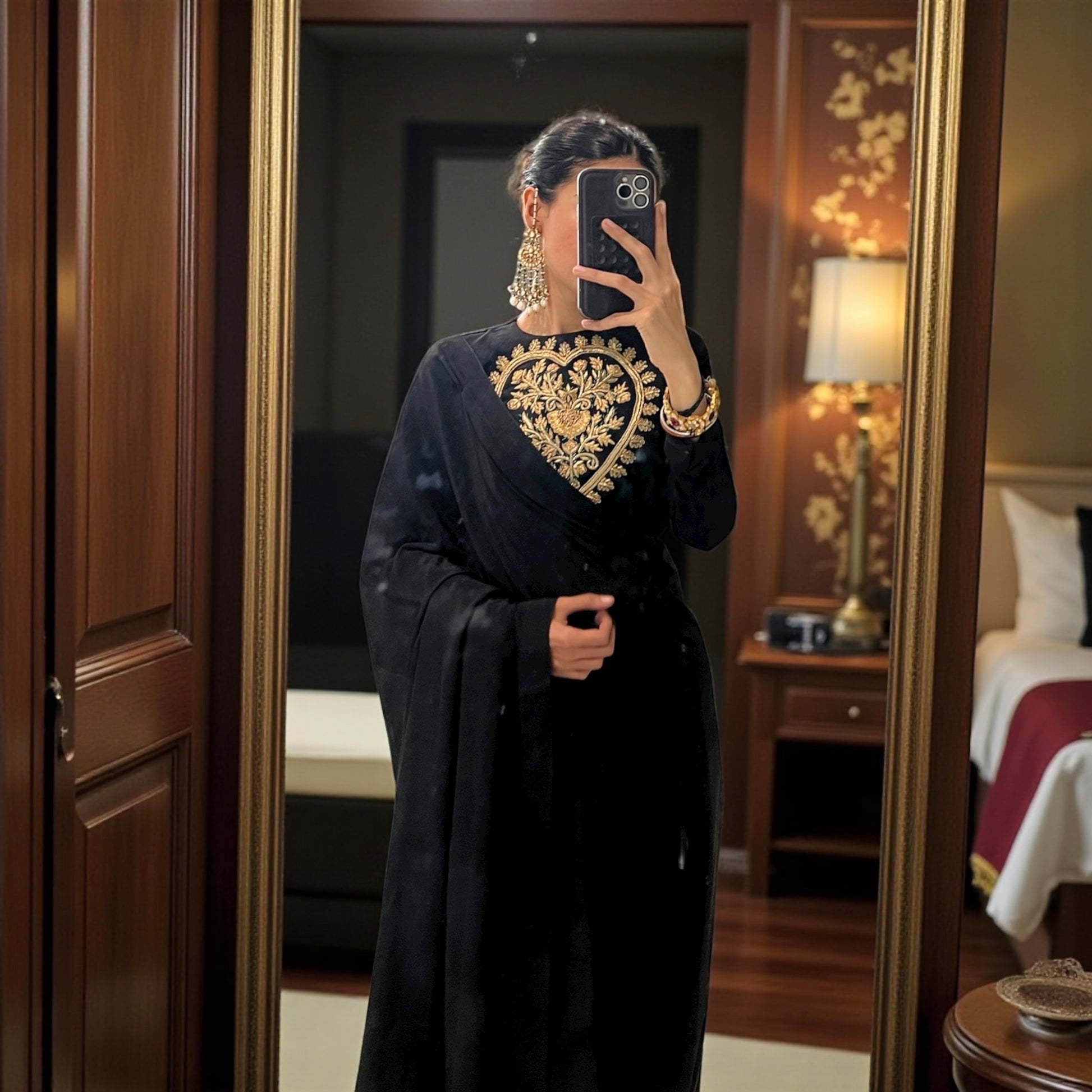 This stunning black timeless saree features intricate gold embroidery that adds a touch of royal charm. The beautifully detailed heart - shaped motif on the blouse creates a bold yet graceful focal point, complemented by the rich black drape that falls effortlessly. Paired with statement gold earrings and bangles, the look blends tradition with modern sophistication- perfect for festive evenings, celebrations , or any ,moment you want to feel radiant.