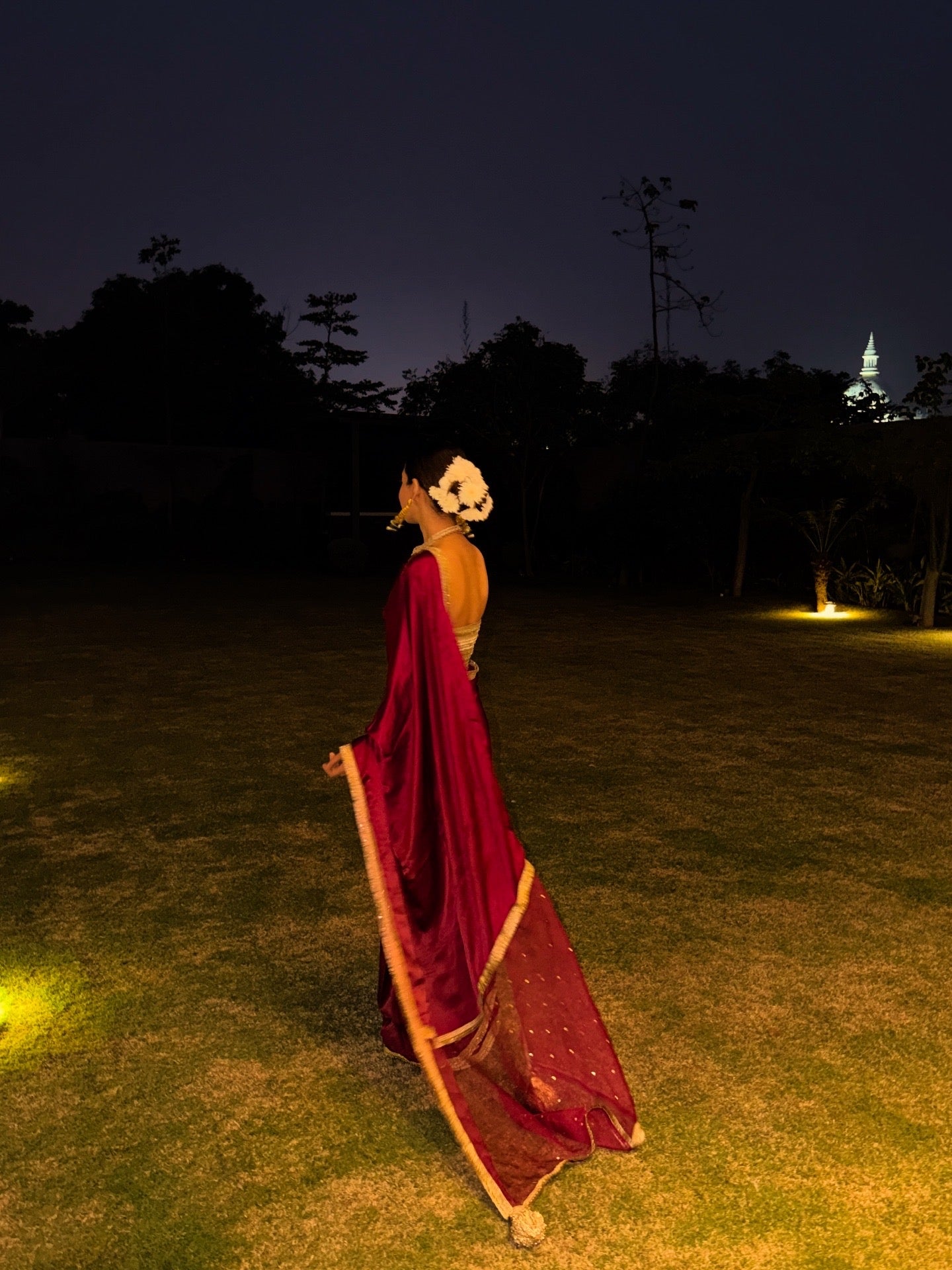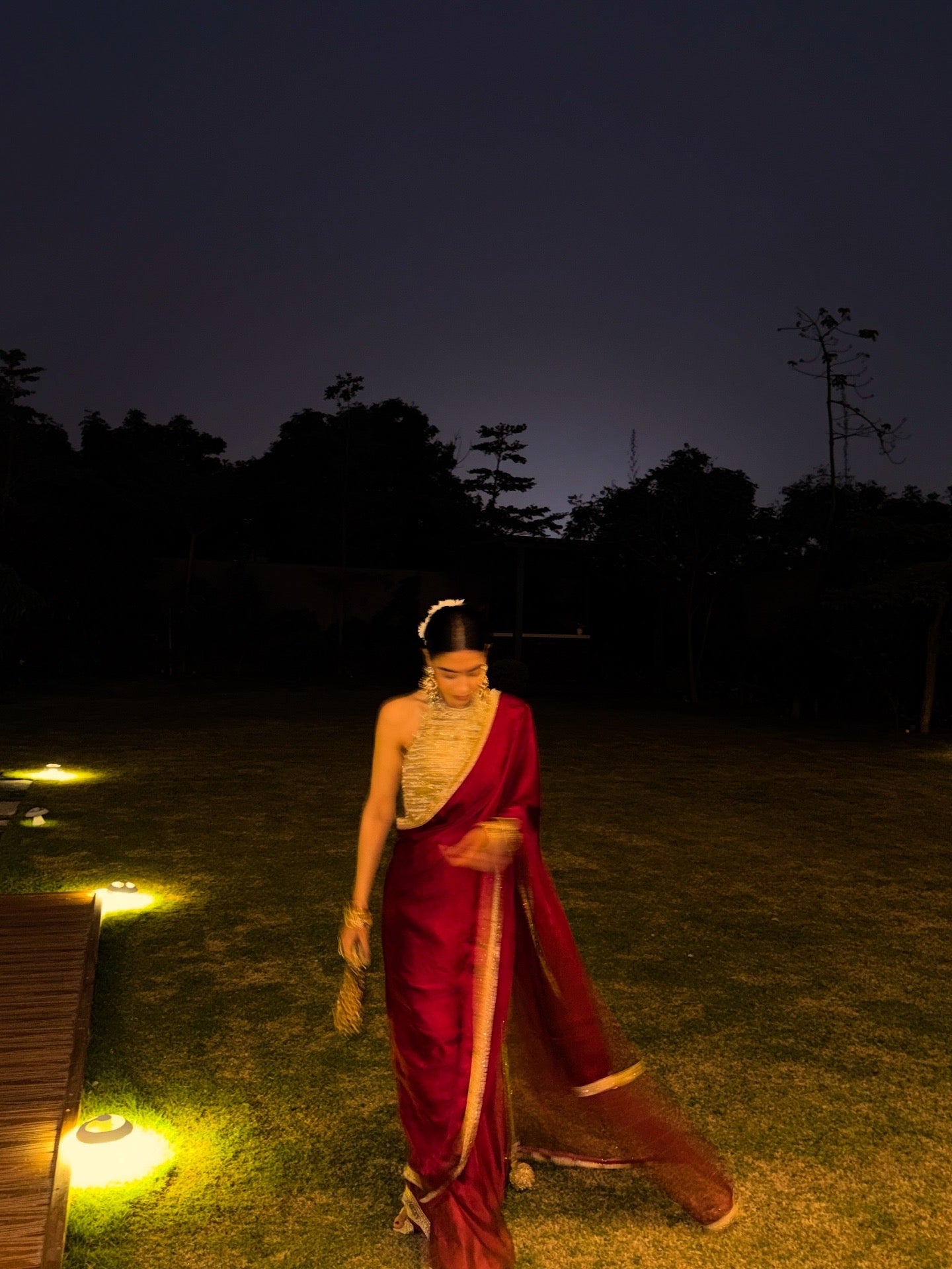 ‘Paired with a meticulously hand embellished gold blouse, it forms a perfect union of modern refinement and classical charm. This saree is designed for the woman who walks into her new chapter with serenity in her eyes, elegance in every breath, and a heart full of noor.