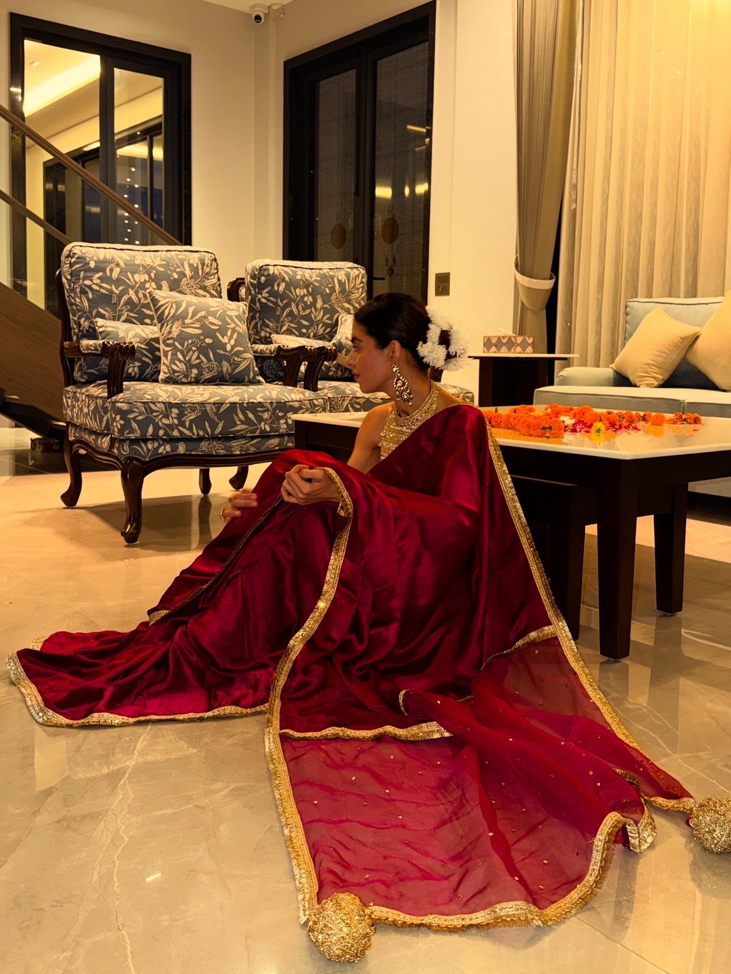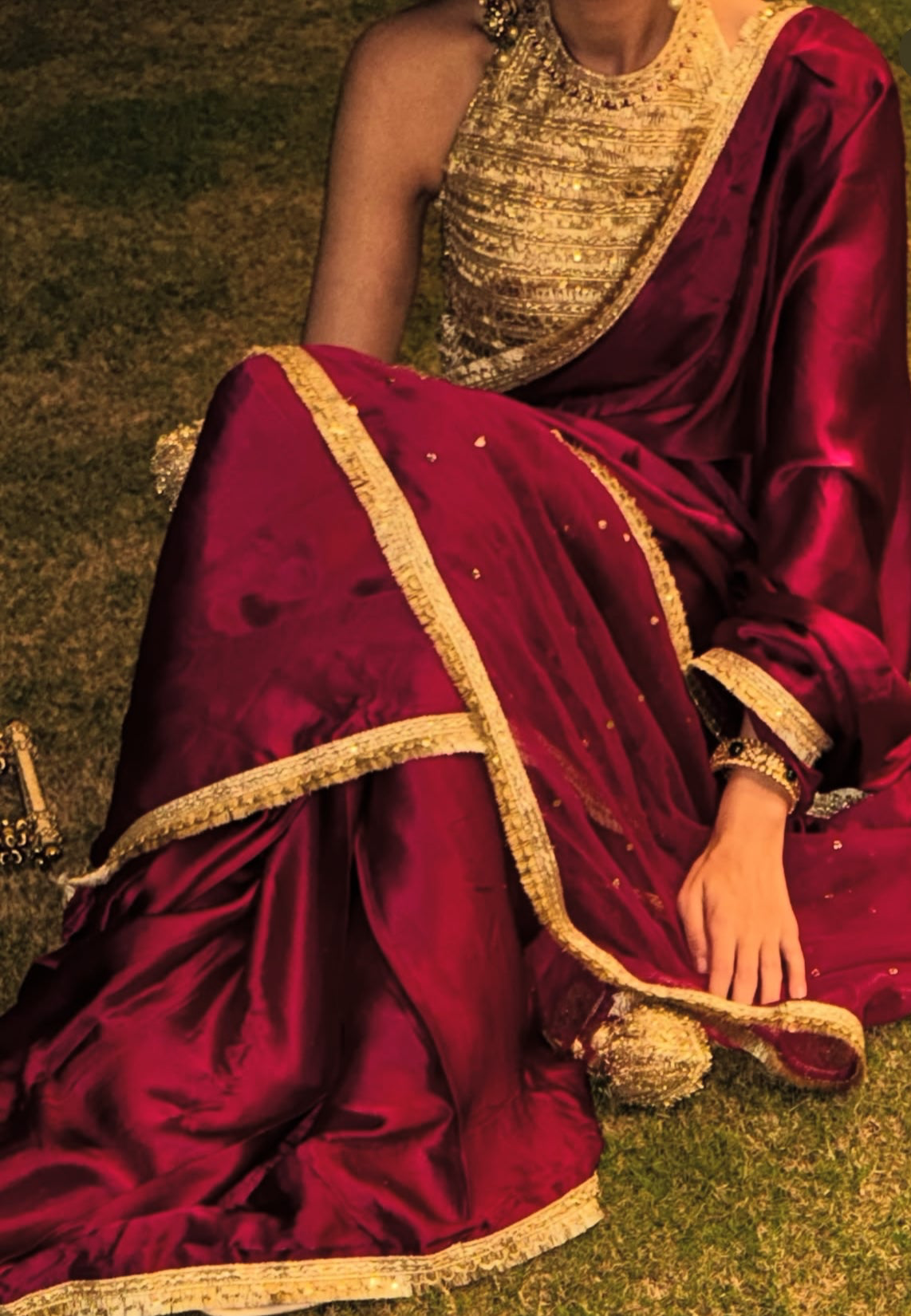 Crafted in deep maroon satin, its luxurious fall and rich sheen evoke the opulence of old - world bridal couture. The saree is framed with an elegantly woven antique gold border, adding a subtle regalia and a whisper of heirloom heritage.