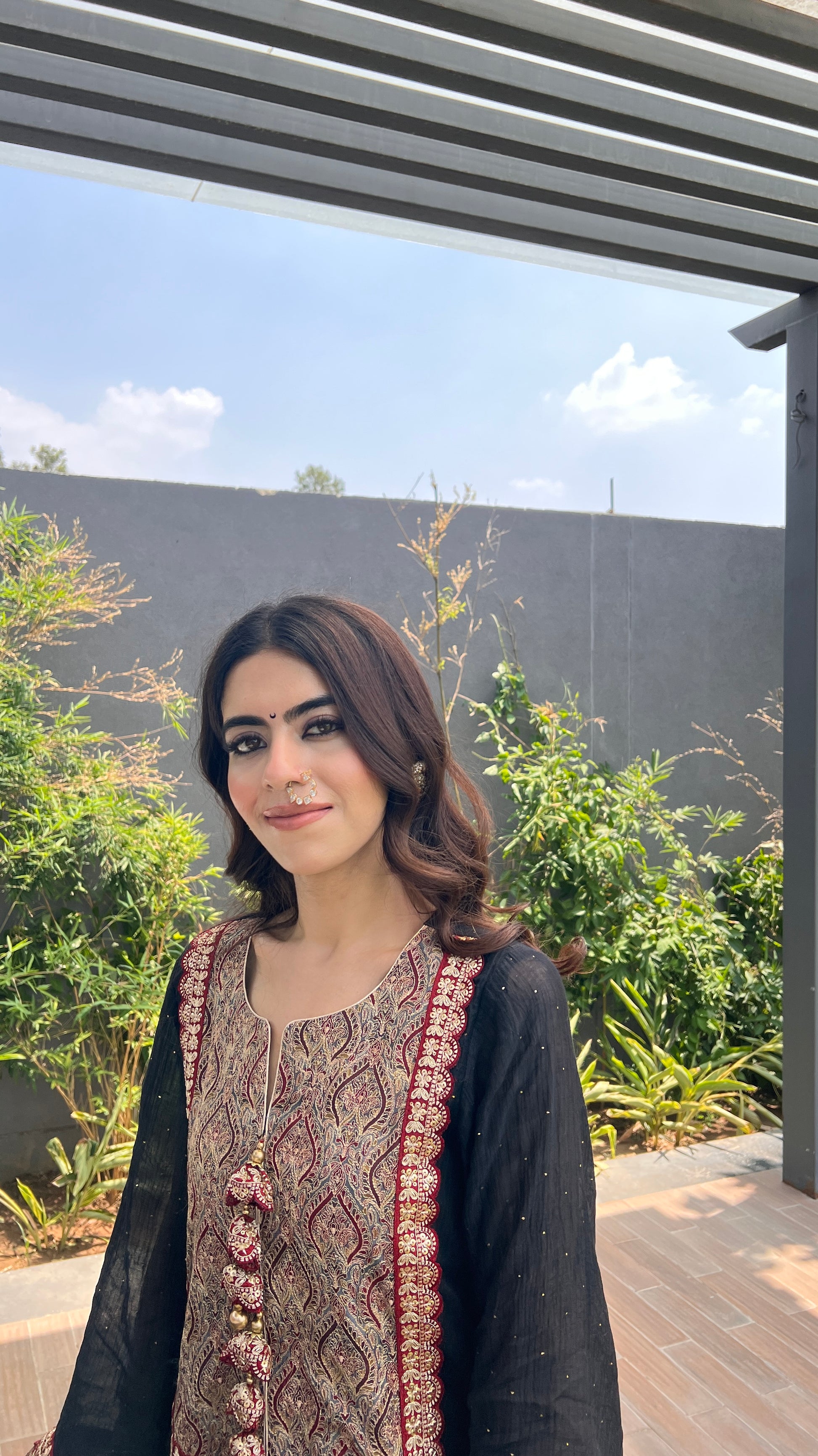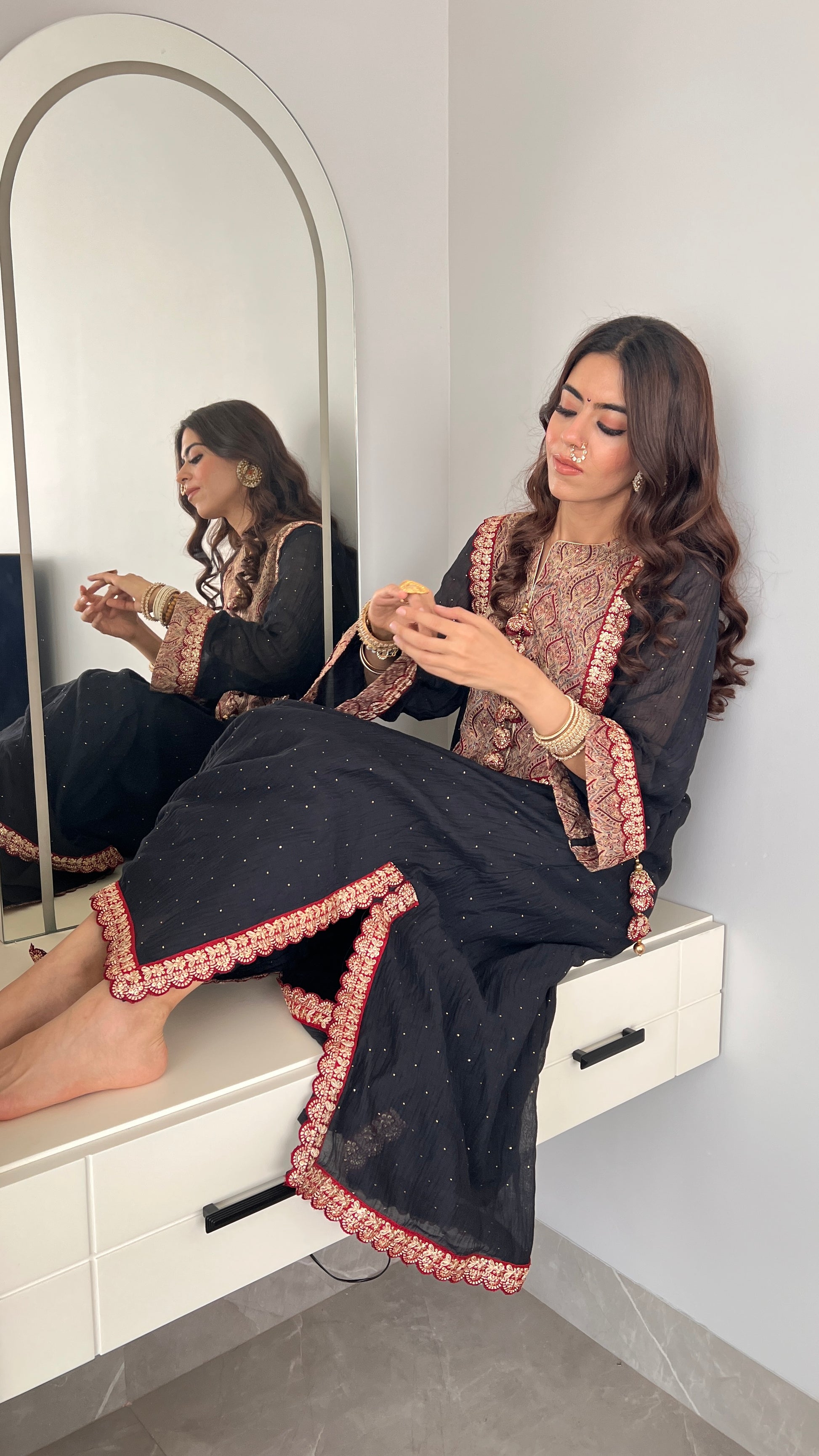 An ode to timeless elegance, the Nazm - e - Noor Kaftan weaves poetry into every thread. This ensemble captures the quiet grandeur of heritage craftsmanship. Handfinished scalloped borders and delicate tassels trace the neckline like verses of light- subtle yet captivating. Perfect for wedding soirées, evening gatherings or moments that call for understated regality, Nazm e Noor is a celebration of feminine strength, serenity and luminous beauty.