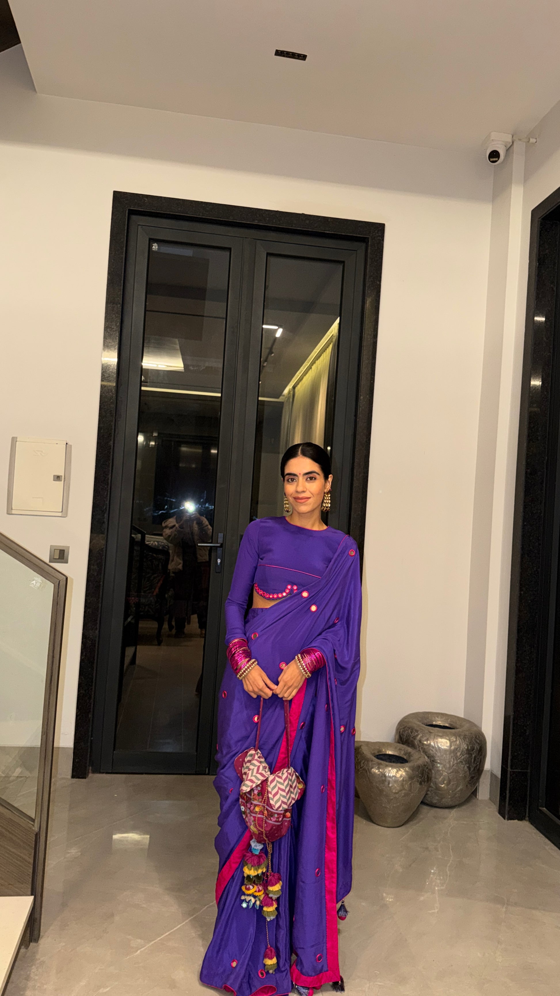 A rich, royal - violet saree beautifully accented with hot - pink piping and scattered embroidered motifs, creating the perfect balance of vibrance and sophistication. The highlight of the ensemble is the contemporary back - tie blouse featuring multiple delicate dori strings adorned with playful tassels, adding movement and charm from every angle. This saree ensemble blends traditional aesthetics with modern detailing, making it ideal for festive celebrations and special occasions.