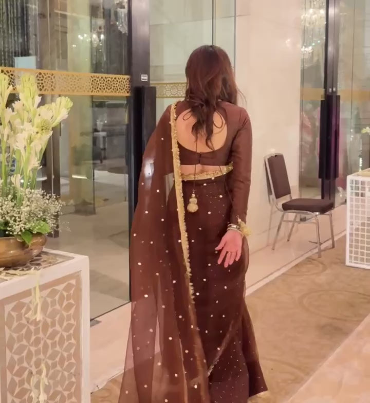 A symphony of grace and allure, these mukaish sarees from the Noor - e - Nikaah collection capture timeless elegance with a modern soul. Crafted in sheer organza adorned with delicate golden mukaish, they glimmer softly- a nod to the quiet opulence of love and celebration.