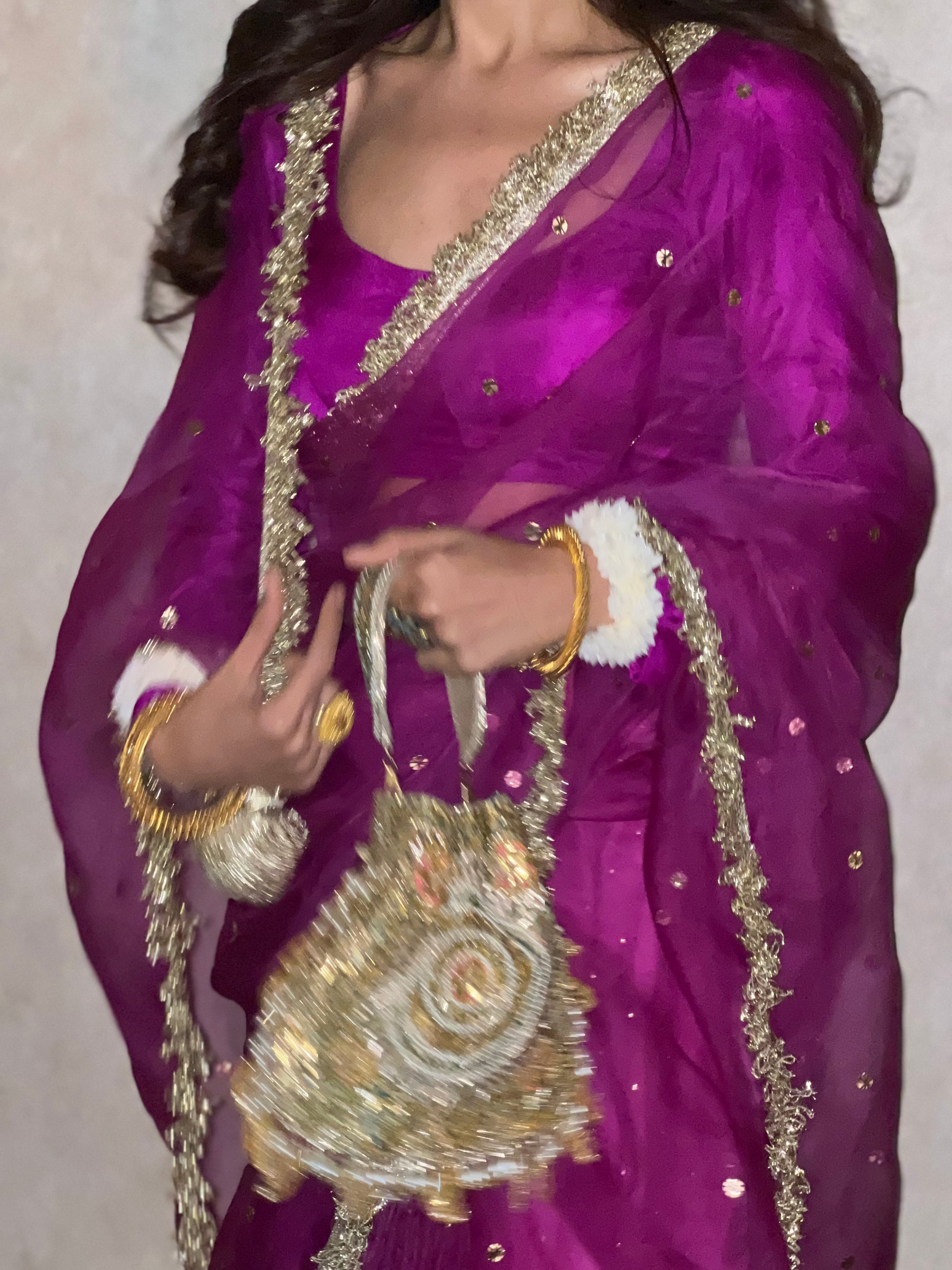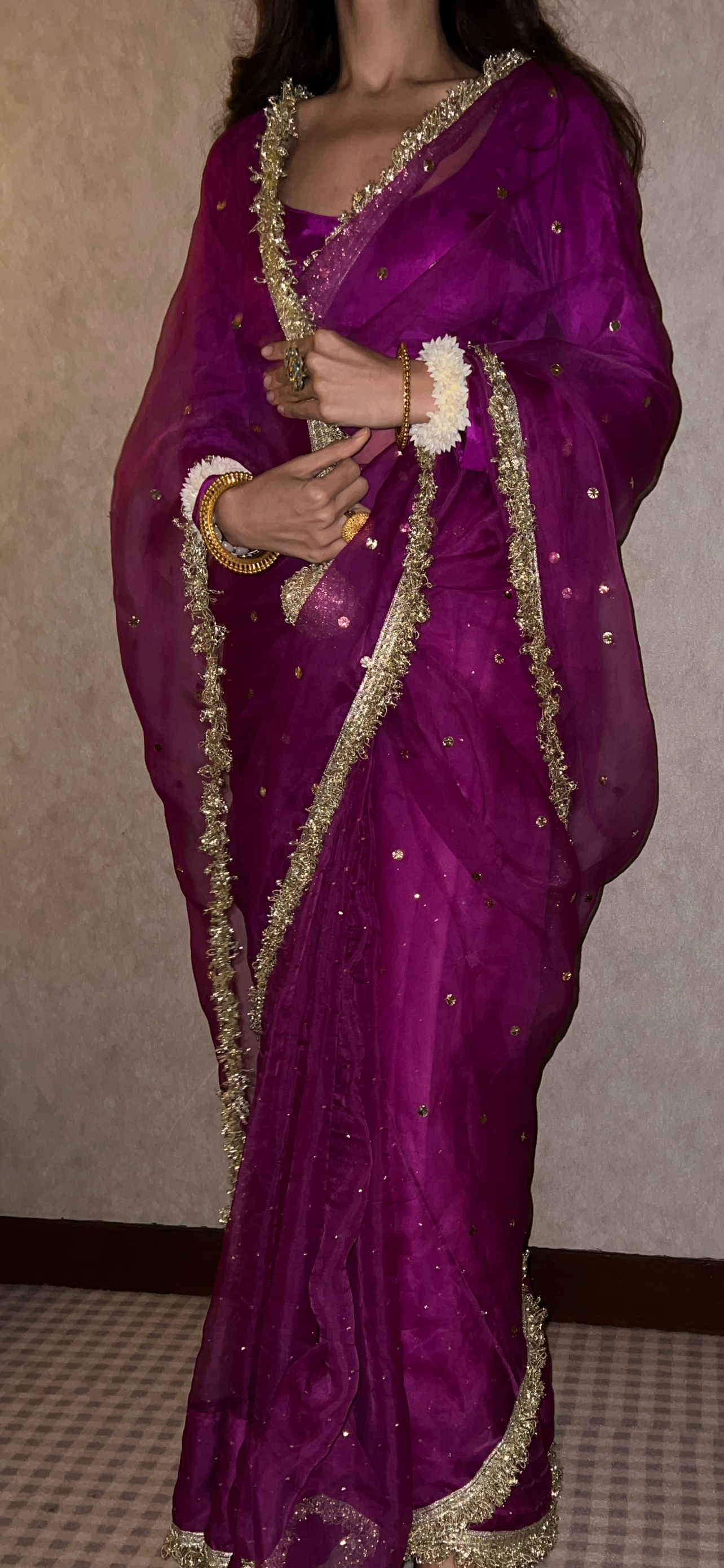 The intricate gota lace border frames the drape with regal finesse, while the statement tassel pally adds a touch of traditional charm. Perfect for wedding festivities, this saree embodies the poetry of glamour- bold yet graceful, mysterious yet radiant.