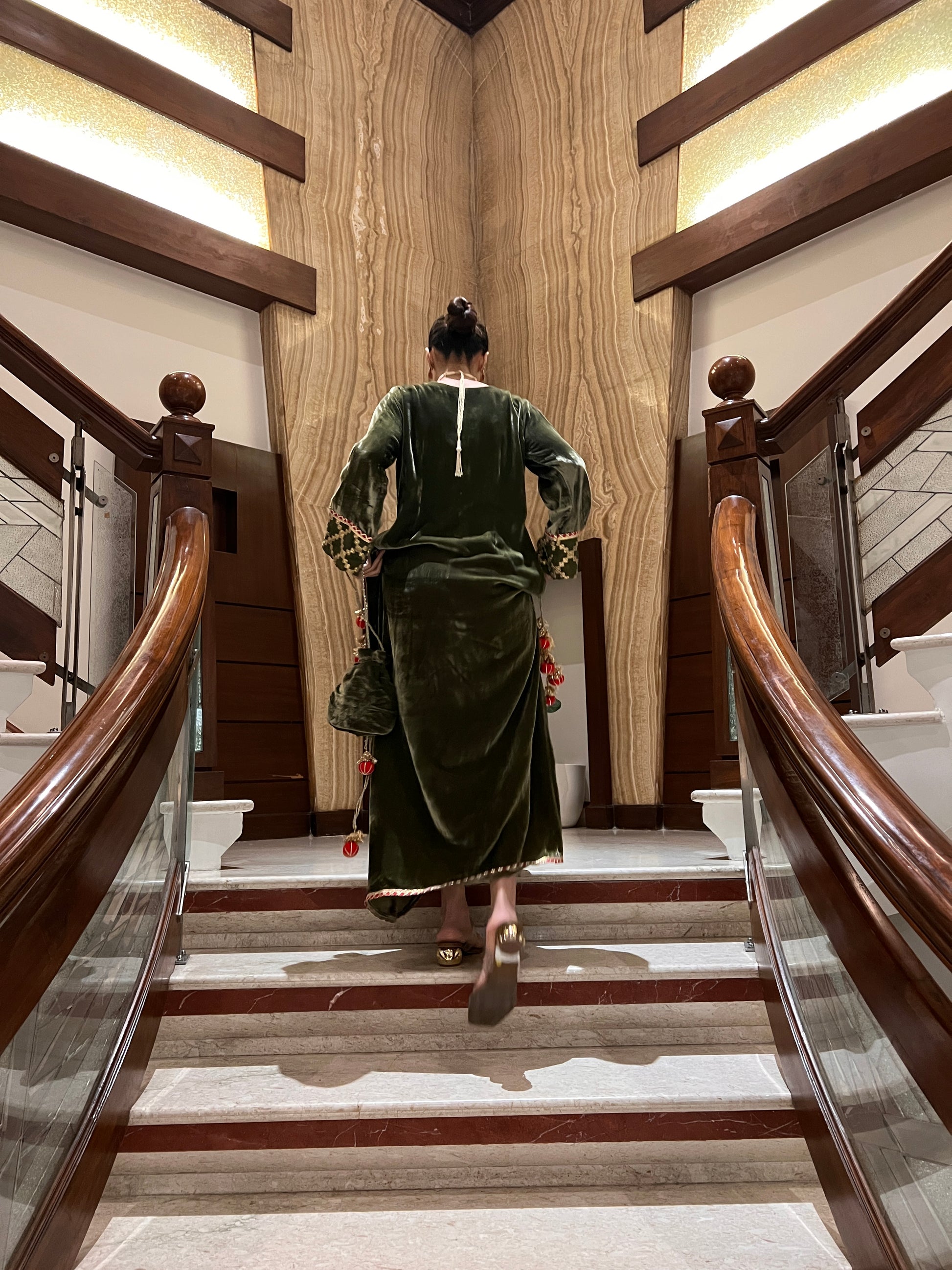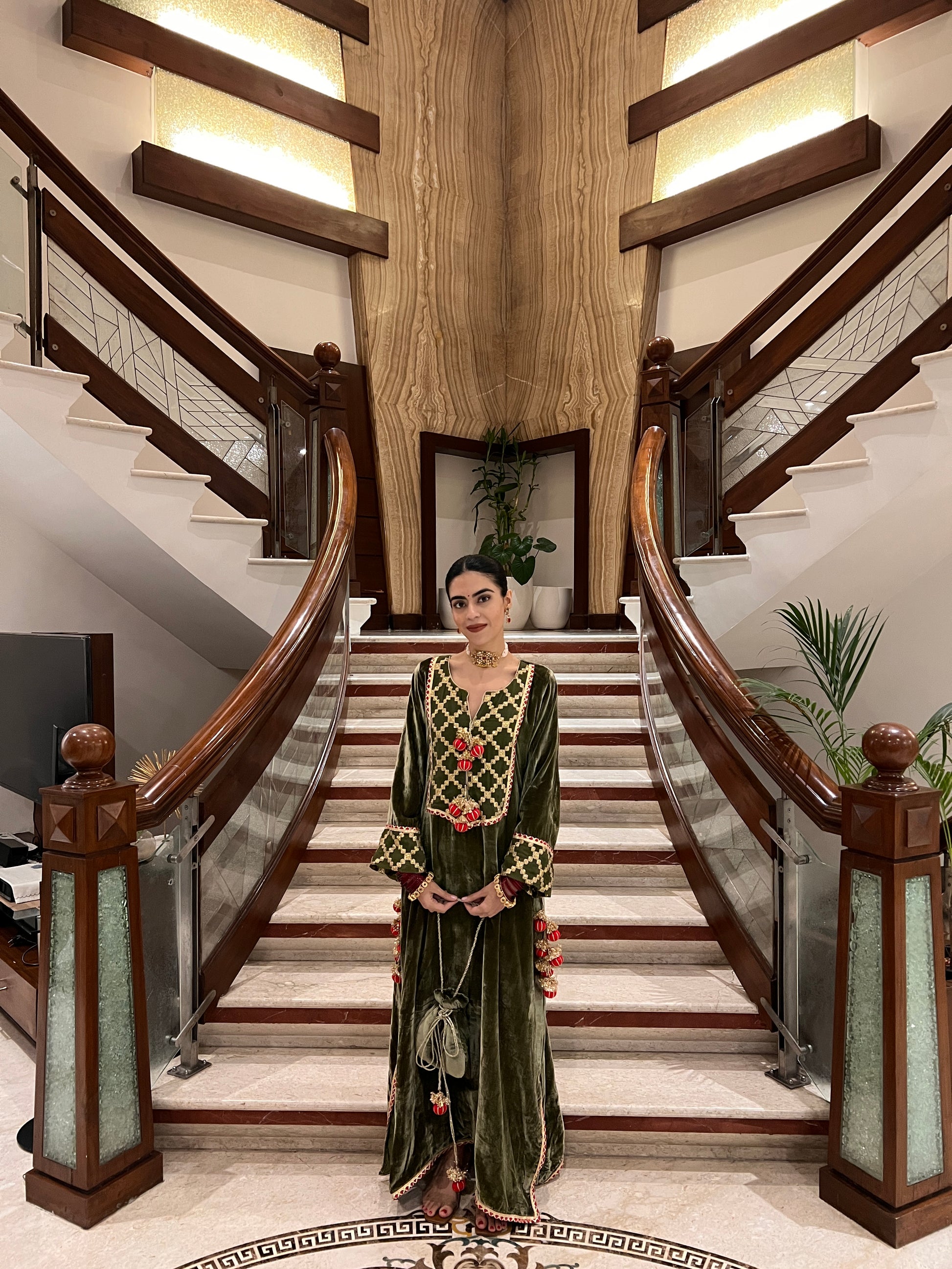 This velvet kaftan embodies serene luxury and refined craftsmanship. The silhouette is soft, fluid and universally flattering, making it ideal for wedding festivities, evening gatherings, or destination celebrations.
