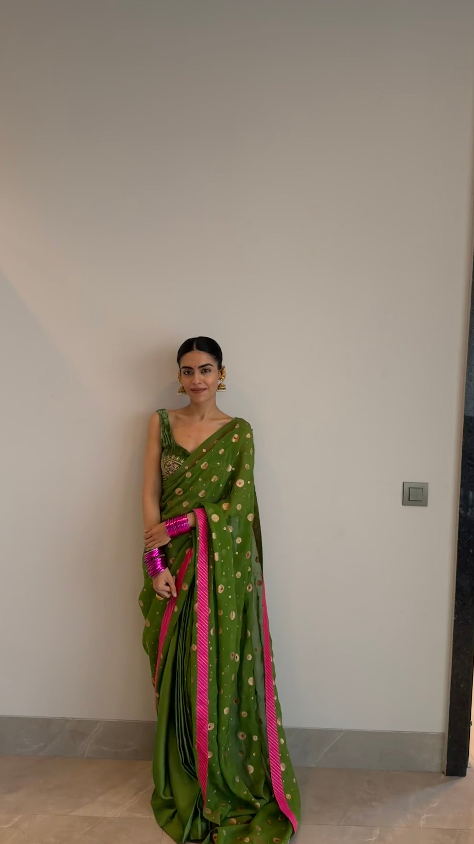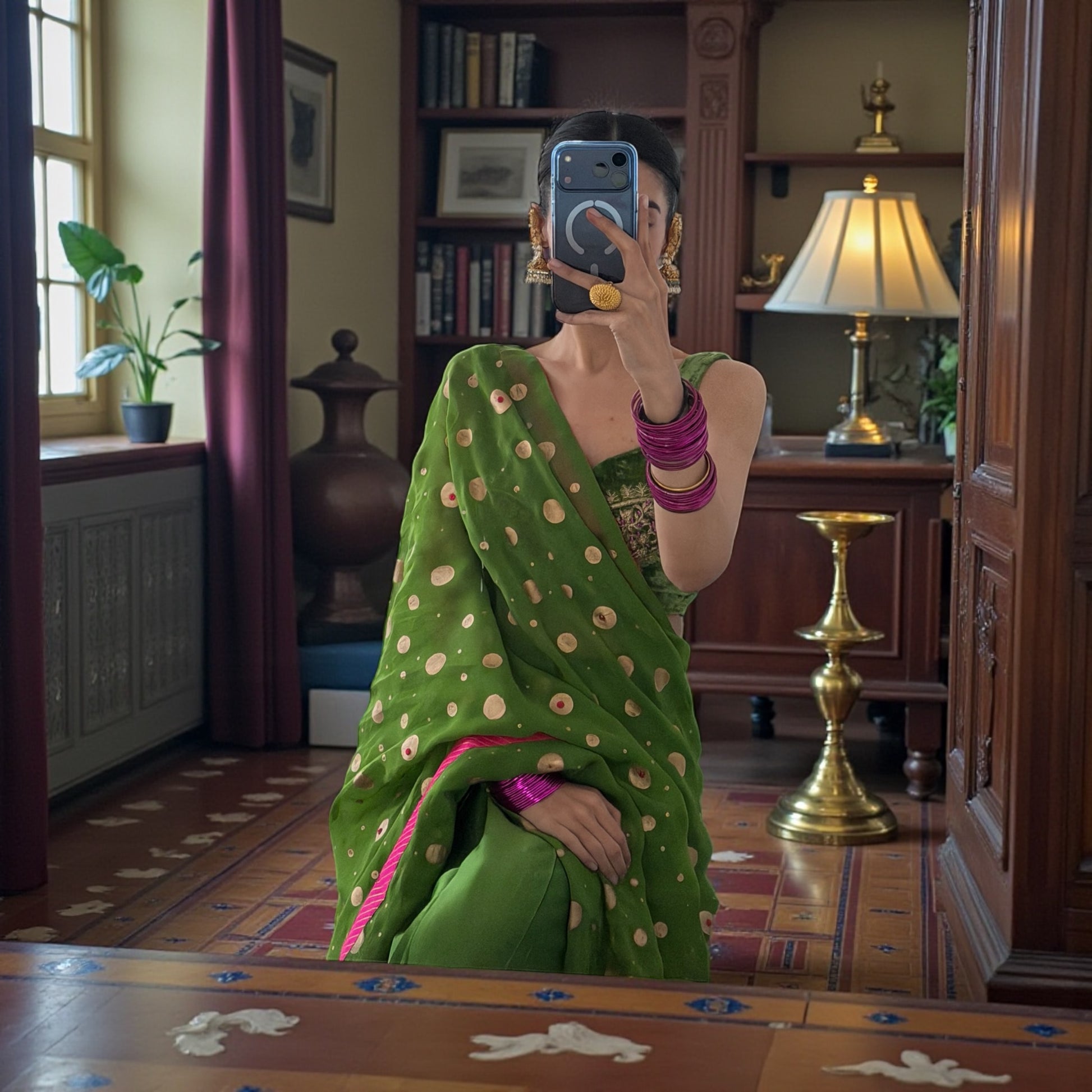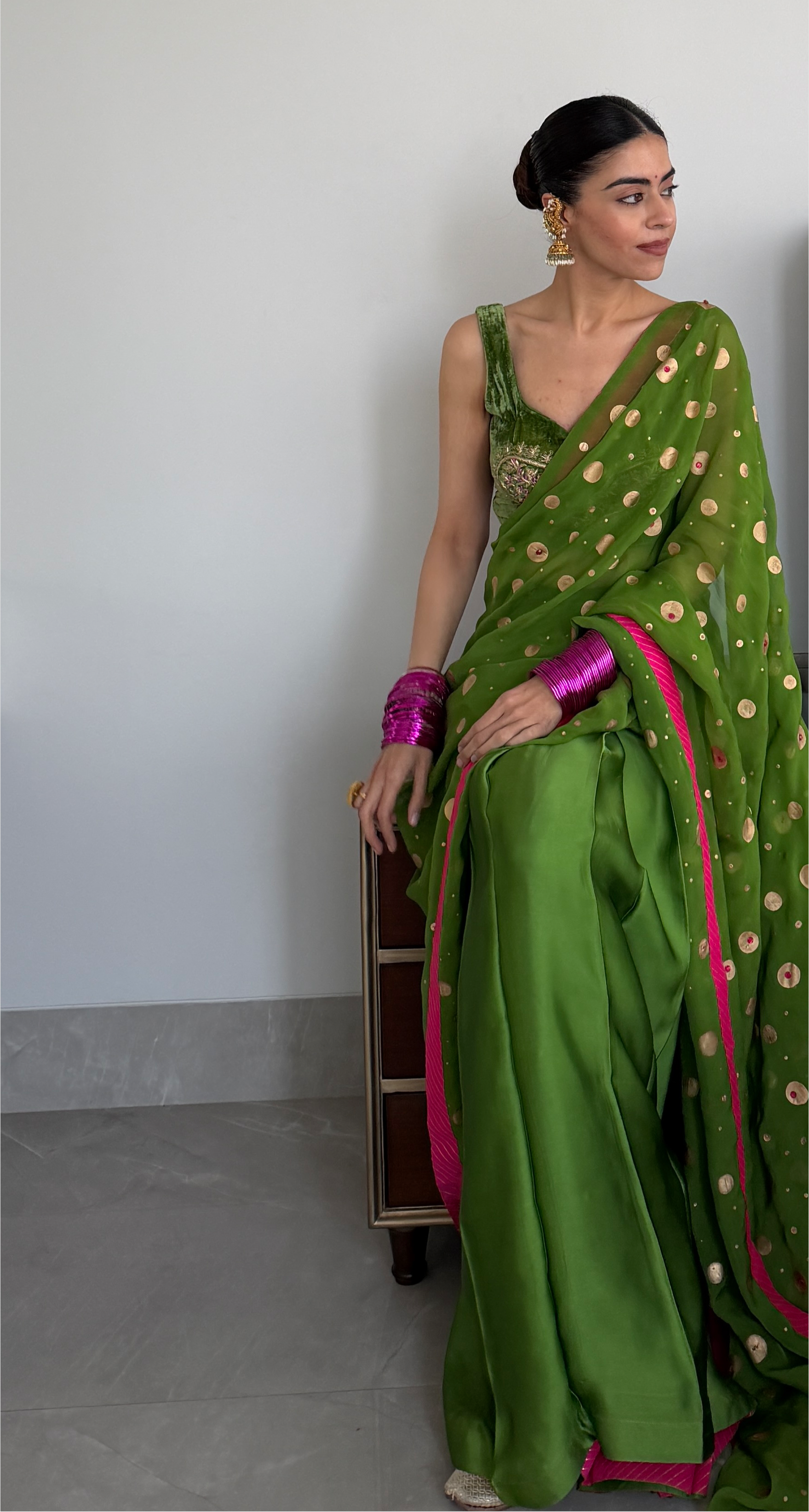 Draped in a deep, serene shade of olive, this saree is an ode to quiet celebration. Crafted in a fluid, lightweight fabric, it creates a silhouette that feels both graceful and grounded. Delicate gold hand painted motifs are scattered across the canvas. A subtle hint of pink along the border lends a gentle contrast - romantic, restrained, and deeply feminine.