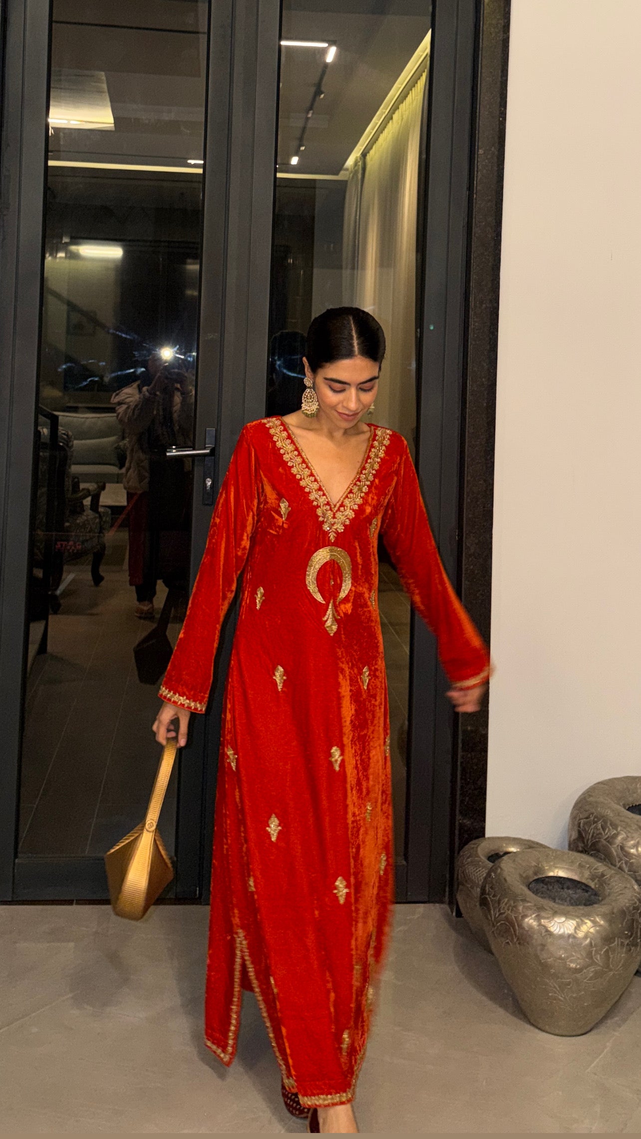 An ode to celestial elegance, this orange velvet kaftan glows like a captured sunset. Crafted from plush, richly textured velvet, the silhouette drapes effortlessly with a regal fall. Delicate moon - inspired embroidery shimmers across the front, adding a touch of mystique and bridal radiance that aligns beautifully with the spirit of Noor - e - NIKAAH.